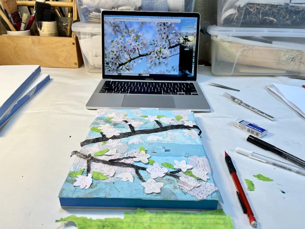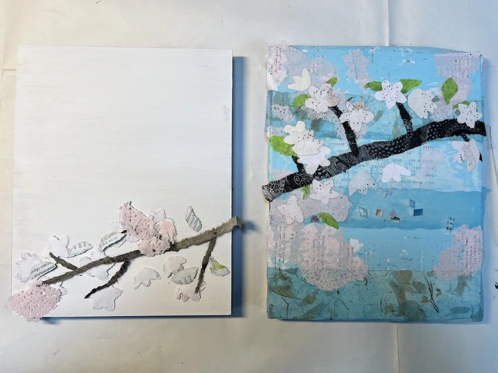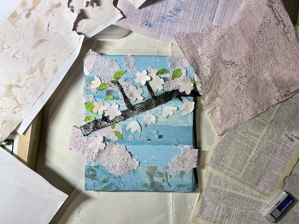 Inspired by the Japanese tradition of haiga (art combined with haiku), I added the haiku to the collage digitally. It is the April art for my 2026 calendar, and I also made a birthday card version, above.