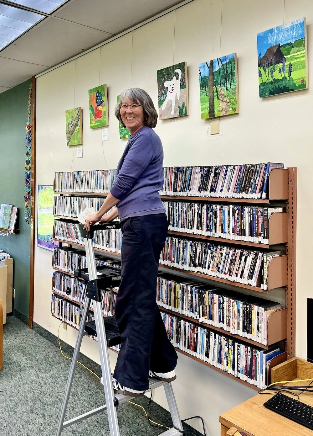 Annette Makino hangs her “Paper Alchemy” show at the Arcata Library, running through May 2026.