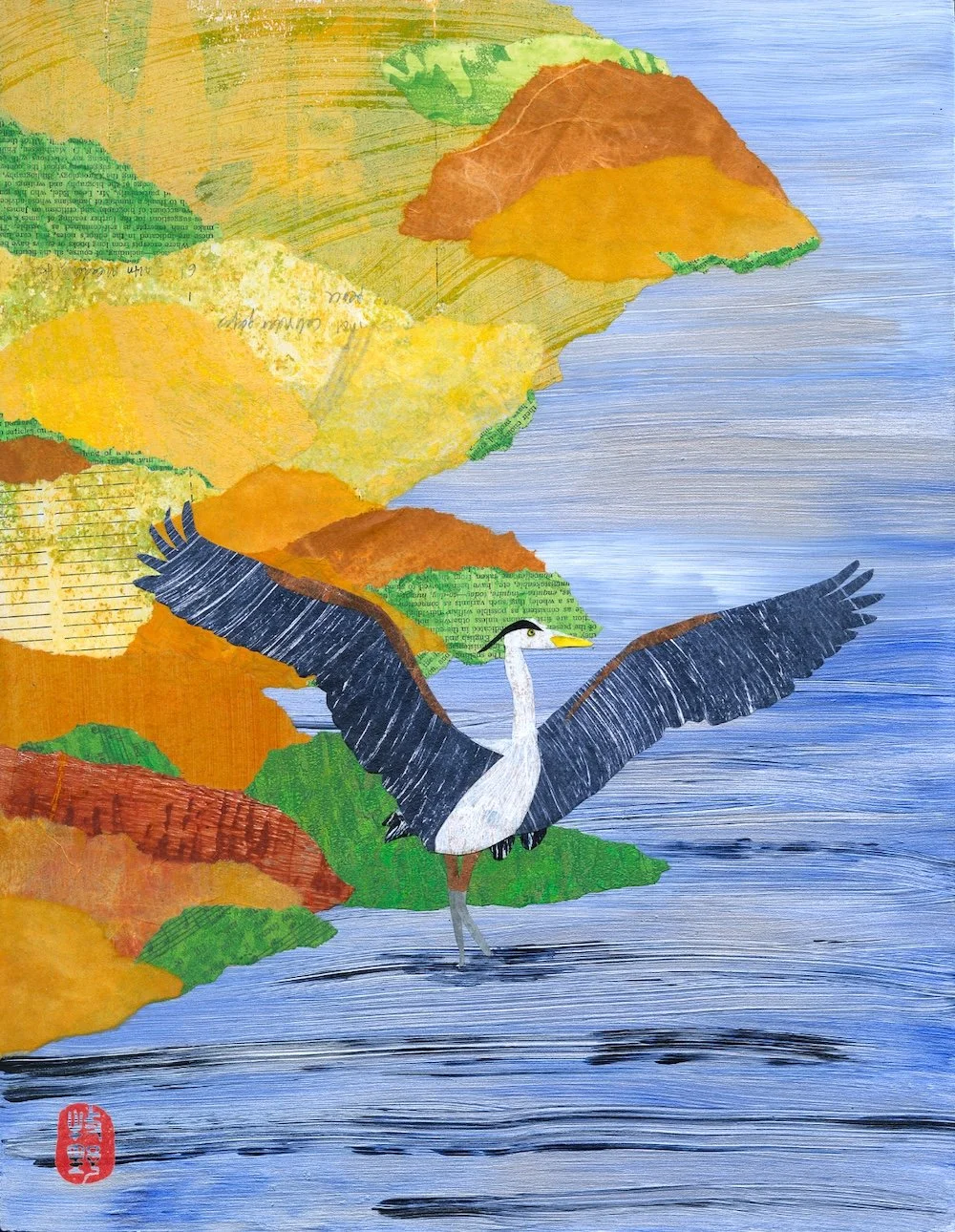 In the show, each of Makino’s artworks has a label with an accompanying haiku. For instance, a collage of a heron along a riverbank goes with this haiku: